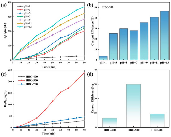 In order to investigate the effect of pH on the amount of hydrogen peroxide produced, the HBC-500 was selected as the subject of this study, and the actual hydrogen peroxide yield from pH = 1–13 was investigated at a constant current of 50 mA·cm−2, and the results are shown in Figure 8a. It can be seen that at the same current density, the actual amount of hydrogen peroxide produced climbs gradually with increasing pH. When the pH = 1, the amount of hydrogen peroxide produced during electrocatalysis can only reach 29.26 mg·L−1 in 90 min. This may be because under acidic conditions, a large number of hydrogen ions are adsorbed on the electrode surface, which makes the contact between electrons and sites on the electrode surface need to break through the thicker double electric layer, and the reduction reaction of hydrogen ions under acidic conditions will occupy most of the sites and energy, which will affect the contact between oxygen and sites. This leads to a reduction in cathodic oxygen reduction efficiency. As the hydrogen ion concentration decreases, a large number of sites on the HBC-500 surface are exposed and the concentration of hydrogen ions adsorbed on the catalyst surface decreases, resulting in faster migration of electrons and ORR intermediates across the catalyst surface and better adsorption of dissolved oxygen to the carbon defect sites, which in turn will lead to higher current utilization efficiency and hydrogen peroxide production per unit time.