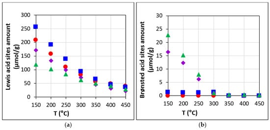 Amount of Lewis acid sites (a) and Brønsted acid sites (b) from pyridine adsorption depending on the temperature of evacuation and the considered support. (●): 0.30 wt%Pt/Al2O3; (■): 0.30 wt%Pt/Siral-5; (♦): 0.30 wt%Pt/Siral-20; (▲): 0.30 wt%Pt/Siral-40.