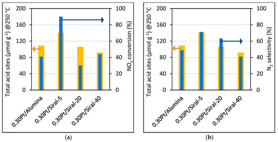 Relationship between the total acid sites (µmol g−1) @250 °C (yellow) and the catalytic behaviour in H2-SCR @250 °C (mcata = 200 mg): (a) NOX conversion (blue); (b) N2 selectivity (blue).