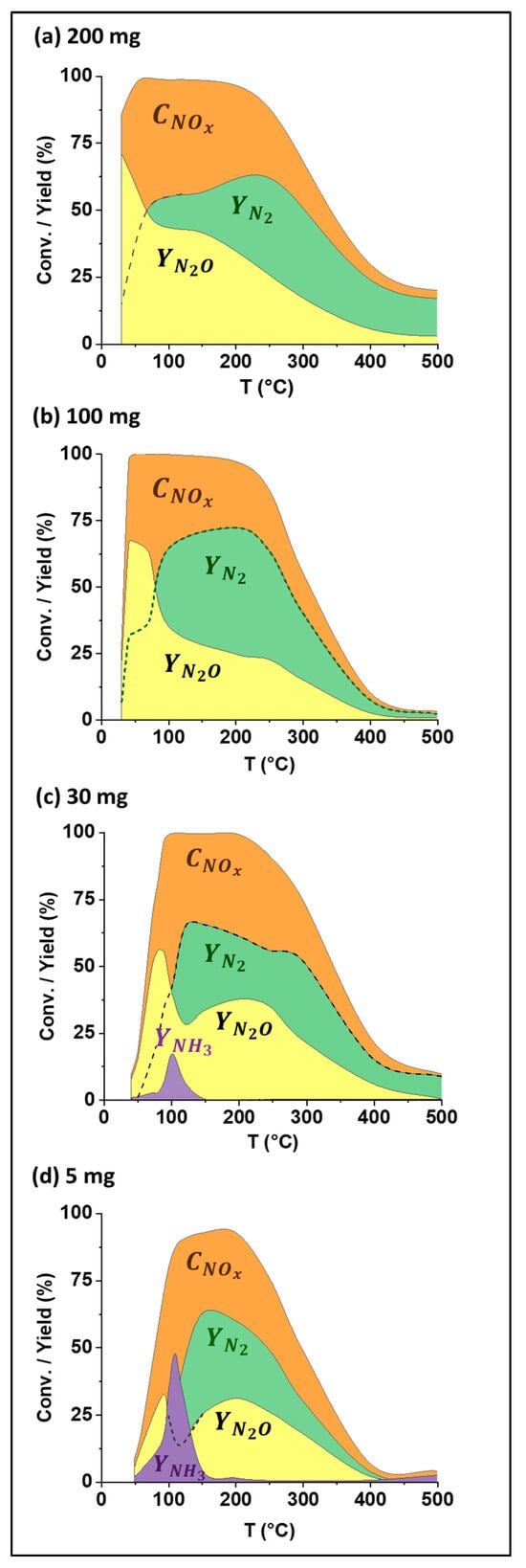 Interestingly, decreasing the catalyst mass significantly influenced the distribution of the products. Particularly, Figure 3c,d shows the detection of NH3 centred around 100 °C, with an increasing amount recorded as the involved mass of the catalyst decreased. This observation indicates that NH3 is mainly formed at the beginning of the catalyst bed before further reaction. Note that a significant ammonia concentration was recorded at the lowest tested temperature when using 5 mg of catalyst (20 ppm at 60 °C). This raises important questions regarding the role of NH3 as an intermediate or by-product, which warrants further investigations. Additionally, decreasing the amount of the catalyst also revealed that N2O emissions split into two distinct broad peaks, one below and one above 100 °C. Surprisingly, the maximum N2 yield remained around 65% regardless of the mass of catalyst ranging from 200 mg to 5 mg. However, the temperature at which this yield was obtained was shifted to lower values, from 250 °C to 120 °C, as the catalyst mass was decreased.