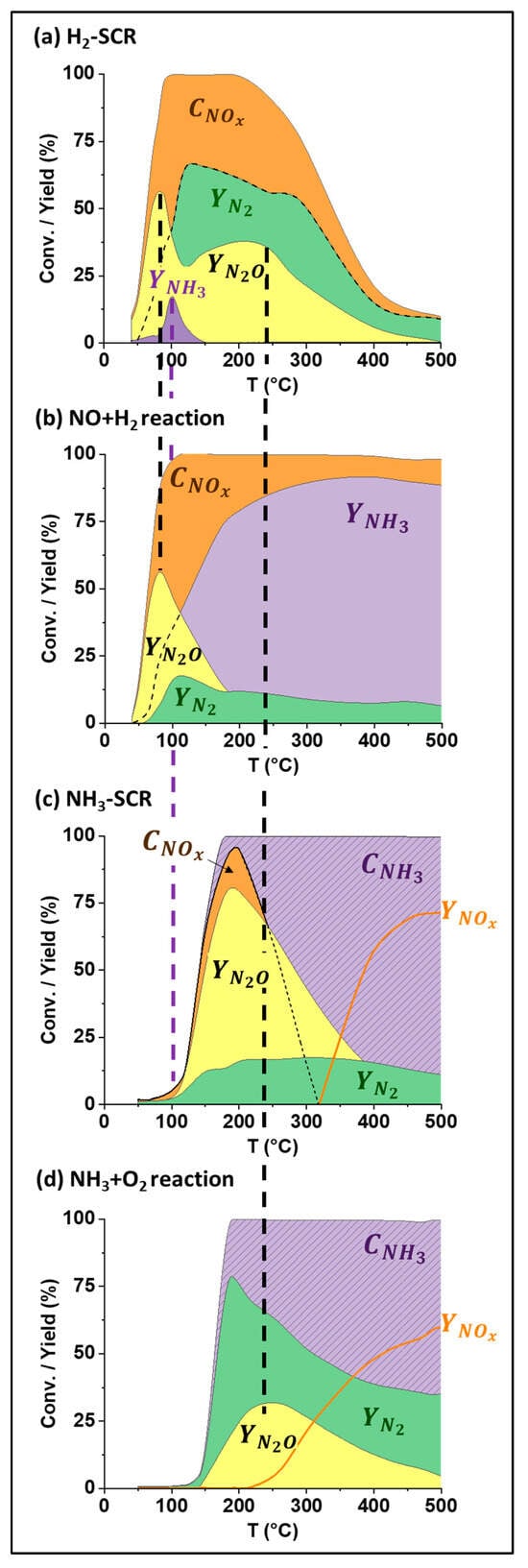 In summary, results in Figure 4d show that the oxidation of NH3 by O2 appears to play a major role in the H2-SCR behaviours, especially at temperatures above 150 °C. This contribution could likely explain the high N2 selectivity observed in the H2-SCR reaction and the formation of the second N2O phase at high temperatures. In contrast, the NH3-SCR appears to be favoured only in a narrow temperature range, between 100 °C and 150 °C.