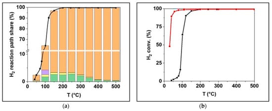): converted H2 leading to N2; black line: total H2 conversion. (b): H2 conversion depending on the reactional mixture (Table 2): (▬) H2-SCR reaction; (▬) H2 + O2 reaction.