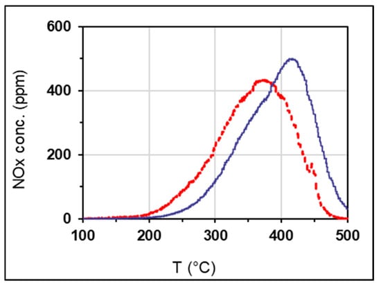 To investigate ammonia formation in the H2-SCR process, a catalytic test was performed without oxygen in the reaction mixture (NO + H2 reaction, Table 2). Particular attention was paid to determine the initial ammonia emission temperature (Equation (1)) in relation to the NOX conversion onset temperature.