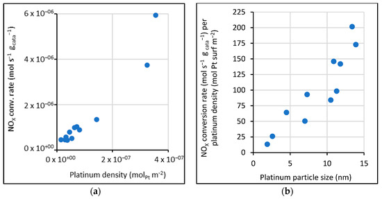 Then, since the considered catalysts exhibited large ranges of specific surface areas and platinum loadings, the influence of the platinum density was examined by plotting the NOX conversion rate at 60 °C (mol s−1 gcata−1) depending on the amount of platinum per square metre (Figure 7a). This figure shows that a high platinum density favours the NOX conversion. It can be then assumed that interactions between platinum particles are beneficial, probably via the mobility of the surface species. It should be noted that no relevant relationship between the NOX conversion rate at 60 °C and the acidity of the catalysts was obtained, which may be attributed to (i) the relatively narrow range in support acidities or (ii) a metal-intensive catalytic reaction.