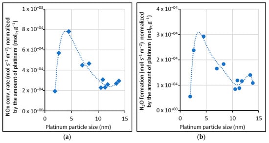 From data reported in Table A2, the turnover frequency (TOF) for the deNOX activity at 60 °C, which corresponds to the amount of converted NOX (mol s−1 g−1) normalized by the amount of surface platinum sites (mol g−1), was plotted in Figure A5 depending on the platinum particle size.