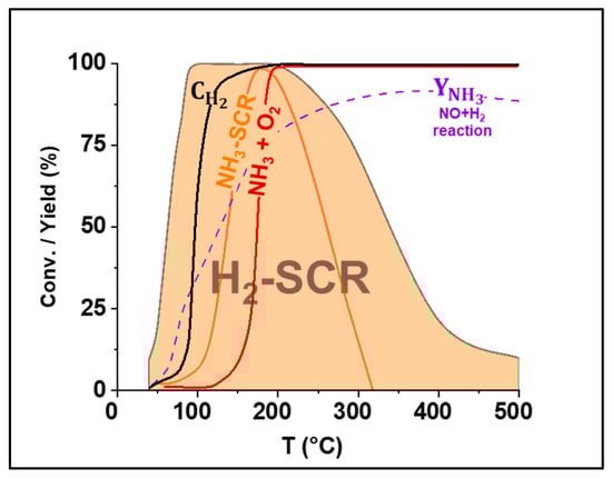 According to the results reported in Figure 4c, NOx reduction by NH3 significantly started at approximately 100 °C, which also corresponds to the drop in NH3 emission under the H2-SCR conditions (Figure 4a). Consequently, ammonia was not involved in low temperature NOX conversion (below 100 °C) during the H2-SCR process. The conversion of NOX by NH3 (NH3-SCR, Figure 4c) reached a maximum at around 200 °C, a temperature at which the NH3 conversion became complete. Thereafter, the conversion gradually declined, becoming negligible at approximately 300 °C. At higher temperatures, the amount of detected NOX exceeded the inlet NOX, which can be attributed to the ammonia oxidation by O2 into NOX (orange line). However, the major product of the NH3-SCR reaction was clearly N2O, while the N2 yield remained around 11–18% in the 200–500 °C temperature range.