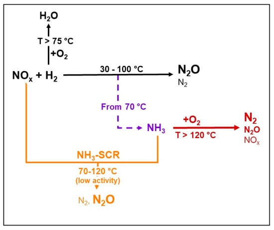 Since the NOX conversion in H2-SCR reached 100% from 100 °C, the availability of NOX for the NH3-SCR reaction was limited to a very narrow temperature window (mostly below 100 °C, while the activity in NH3-SCR was still limited). As a result, the maximum outlet NH3 was observed around 100 °C and the role of the NH3-SCR in the whole H2-SCR process appeared very limited. On the contrary, the ammonia oxidation by O2, which started near 120 °C, significantly contributed to the H2-SCR process. This reaction appeared responsible for the second N2O emission peak (150–500 °C, Figure 5), and also facilitated the N2 formation as the main product. The optimal N2 yield was observed when H2 conversion reached 100%, around 150 °C, which can be attributed to the optimal ammonia formation followed by its oxidation by O2. These results are in accordance with the very recent work of Dong et al. on Pt/SSZ-13 catalysts [20]. They propose that the NH3-SCR route, resulting mainly in N2O formation and limited N2 selectivity occurs mainly below 150 °C, while the oxidation of the generated NHX+ species at a higher temperature favours N2 formation. These various reaction pathways are finally summarized in Figure 10.
