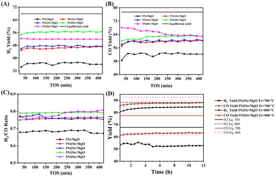 Catalytic activity results in 5Ni/MgO and 5NixSr/MgO (x = 1, 2, 3, 4 wt%) catalysts at 700 °C: (A) H2 yield vs. TOS, (B) CO yield vs. TOS, (C) H2/CO ratio vs. TOS. (D) Experimental and equilibrium yields for H2 and CO are compared during 12 h over a 5Ni3Sr-MgO catalyst at 700 °C and 800 °C.