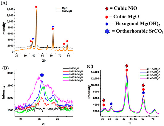 XRD patterns of (A) MgO and Ni/MgO in the 2θ range of 20–80°, (B) X-ray diffraction pattern of 5NixSr/MgO (x = 0, 1, 2, 3, 4 wt%) in the 2θ range of 24–27°, and (C) 5NixSr/MgO (x = 1–4 wt%) in the 2θ range of 42–80°.