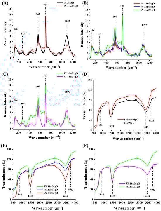 Raman spectra of (A) 5Ni/MgO and 5Ni1Sr/MgO, (B) 5NixSr/MgO (x = 1, 2, 3 wt%), and (C) 5NixSr/MgO (x = 3, 4 wt%). FT-IR of (D) 5Ni/MgO and 5Ni1Sr/MgO, (E) 5NixSr/MgO (x = 1, 2, 3 wt%), and (F) 5NixSr/MgO (x = 3, 4 wt%).
