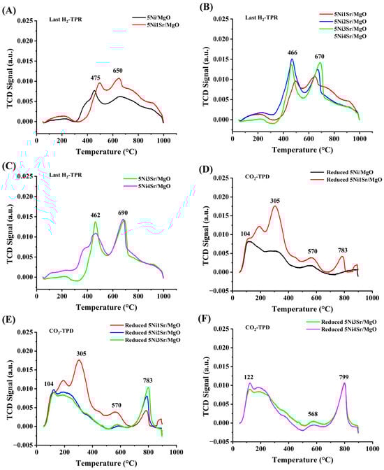 The last H2-TPR of the cyclic H2TPR-O2TPO-H2TPR experiment of (A) 5Ni/MgO and 5Ni1Sr/MgO, (B) 5NixSr/MgO (x = 1, 2, 3 wt%), and (C) 5NixSr/MgO (x = 3, 4 wt%). CO2-TPD of reduced catalysts (D) 5Ni/MgO and 5Ni1Sr/MgO, (E) 5NixSr/MgO (x = 1, 2, 3 wt%), and (F) 5NixSr/MgO (x = 3, 4 wt%).