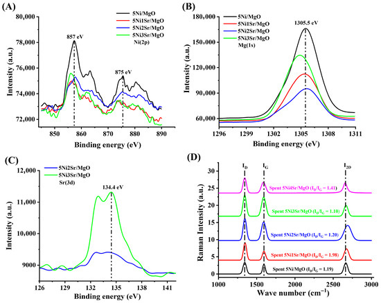 The XPS spectra of 5Ni/MgO and 5Ni3Sr/MgO catalysts: (A) Mg(1s), (B) Ni(2p), and (C) Sr(3d). (D) Raman spectra of spent 5Ni/MgO and 5NixSr/MgO (x = 1, 2, 3, 4 wt%).