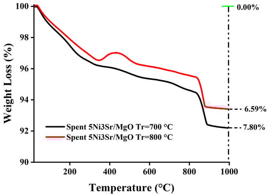 The thermogravimetric analysis (TGA) of the spent catalysts is presented in Figure 6. The weight loss profiles of spent 5Ni3Sr/MgO catalysts used in the DRM reaction at 700 °C and 800 °C were analyzed. The initial weight loss at lower temperatures can be attributed to the evaporation of adsorbed moisture. The weight gain at about 400 °C is due to oxidation of metallic Ni into NiO [38]. The further steady loss with increasing temperature is due to the oxidation of carbon deposits over the catalyst surface. At elevated temperatures (>800 °C), a more significant weight loss is observed, which may be associated with the decomposition of SrCO3, as previously studied [49]. Notably, the catalyst that is investigated at 700 °C has an additional weight gain at about 400 °C. Due to this weight gain, this catalyst has less weight loss (6.59%) than the catalyst investigated at 800 °C (weight loss 7.8%).