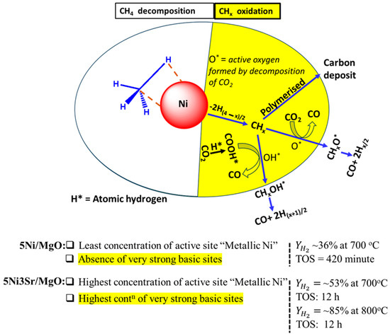 Upon the addition of 1 wt.% Sr over 5Ni/MgO, the surface area and pore volume decline, but the concentration of active sites as well as basic sites of a wide range (from weak to very strong strength) grows (Figure 4A,D). Raman’s results show that the carbon deposit over 5Ni1Sr/MgO has the lowest degree of graphitization and is easily oxidizable. Overall, with its enriched reducibility–basicity profile and deposit of oxidizable carbon, 5Ni1Sr/MgO shows enhanced catalytic activity (46–47% H2 yield with a 0.76 H2/CO ratio over 420 min) towards DRM. The improved H2/CO ratio shows the inhibition of RWGS up to an extent. The drop in the surface area, the rise in concentration of active sites, and the rise in concentration of very strong basic sites continue over 2 wt.% Sr loading also. 5Ni2Sr/MgO has comparable catalytic activity to that of the 5Ni1Sr/MgO catalyst. Over 5Ni3Sr/MgO, the crystallinity of the catalyst drops (Figure 2C), the surface area remains comparable (to that of 5Ni2Sr/MgO), the concentration of stable active sites is the highest, and the optimum concentration of very strong basic sites is attained (Figure 4B–D). The catalyst’s surface is enriched with Mg2+ and Sr2+ (more than the rest of the Sr-promoted catalysts), and the Mg2+–Sr2+ ion pair leads to oxide enrichment about Mg2+ (Figure 5B,C). All these surface phenomena make 5Ni3Sr/MgO the best DRM catalyst, and it achieves 55–57% H2 yield with a ~0.8 H2/CO ratio up to 420 min. With higher Sr loading (4 wt.%) over 5Ni/MgO, the crystallinity of the support is the lowest and the optimum concentration of very strong basic sites is also obtained, but the formation of bulk NiO species (weakly interacted NiO) limits the catalytic activity to ~52% H2 yield up to 420 min. This means 5Ni3Sr/MgO is the best catalyst in this series, and it was tested in a long-time study (12 h), where it showed a constant 53% H2 yield with a constant 0.8 H2/CO ratio at 700 °C. Upon increasing the reaction temperature to 800 °C over the 5Ni3Sr/MgO, the H2 yield went up to 85% and the H2/CO ratio to 0.95 for 12 h due to the endothermic nature of the reaction. After a thorough study, it was found that the active site and basic site functionalities over the catalyst surface catalyze the DRM reaction over 5Ni/MgO and 5NixSr/MgO (x = 1, 2, 3, 4 wt%) catalysts. The Ni NiO interconversion continues in the presence of oxidizing and reducing gases, and the concentration of metallic Ni in the presence of CO2 and H2 is the real active site for reaction. The salient reaction mechanism of DRM and characteristic features of the current catalyst system for regulating catalytic activity are presented in Figure 8. The “Ni” active site catalyzes CH4 decomposition into CHx (x = 1, 2, 3). In a CH4−D2 exchange experiment and DFT study, Zeng et al. showed that CH4 is adsorbed over metallic Ni and sequentially dehydrogenates over it [51]. CO2 is adsorbed, activated, and then dissociated over the catalyst surface. Sr+2 and MgO serve as sorbents of CO2. The trapped CO2 (by Sr+2 and MgO) is further activated at close proximity to Ni (at the Ni–support interface or Ni–promoter interface), and finally, activated CO2 is dissociated [52,53]. Overall, CO2 is dissociated into CO and O* over an oxygen-deficient lattice, and CO2 can be assisted by H* to form COOH* species which further decompose into CO and OH* [54,55,56,57]. The surface-active O* and OH* species oxidize CHx selectively into CHxO* and CHxOH*, respectively, which are finally decomposed into a mixture of CO and H2 (syngas). The adsorbed methane fragments may also be polymerized into a coke deposit over the catalyst surface. The stable active sites (shown by the H2-TPR reduction peak about 560 °C in Figure 4) and very strong basic sites (shown by the CO2 desorption peak about 780 °C) over the catalyst are found to be the most crucial factor in determining catalytic activity towards DRM. The minimum activity over 5Ni/MgO is due to the minimum concentration of active sites (including the minimum concentration of stable active sites) and the lack of very strong basic sites. The excellent activity over 3 wt% Sr-promoted 5Ni/MgO is due to the presence of the highest concentration of stable active sites and very strong basic sites.