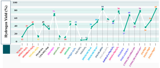 Figure 9 and Table S1 compare [58,59,60,61,62,63,64,65,66,67] the hydrogen yield of various catalyst systems. The current catalyst system outperforms others in terms of H2 yield [68,69,70,71,72]. The H2 yield over Ni catalyst dispersed over lanthana-zirconia was found to be comparable, but in terms of catalyst cost, again, the current catalyst system (5Ni3Sr/MgO) is cheaper. Overall, the current catalyst system attracts attention due to its high H2 yield at a lower cost.