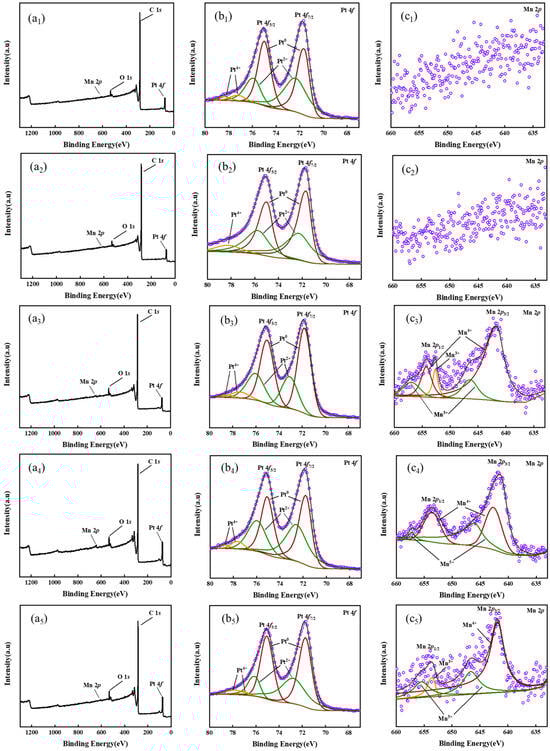 (a1–a5) XPS survey spectra, (b1–b5) high resolution Pt 4f spectra, (c1–c5) Mn 2p spectra of Pt/xMnO2-CNTs, X = 10, 15, 20, 25, 30, respectively.