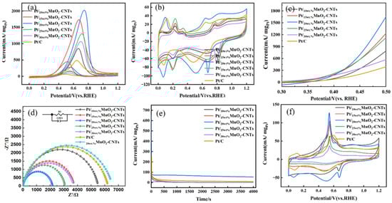 Electrocatalytic performances of Pt/xMnO2-CNTs (X = 10, 15, 20, 25, 30 wt.%) electrocatalyst. (a) The mass-normalized CV in 1.0 M KOH +1.0 M methanol at 50 mV s−1; (b) the CV curves for MOR recorded in 1.0 M KOH at 50 mV·s−1; (c) LSV curve; (d) EIS energy quister diagram; (e) CA curves of the catalysts for MOR at a potential of 0.7 V vs. SCE; (f) CO-Stripping curves in 1.0 M KOH solution.