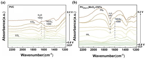 (a) Pt/C and (b) Pt/20wt.%MnO2-CNTs in situ infrared spectroscopy analysis.