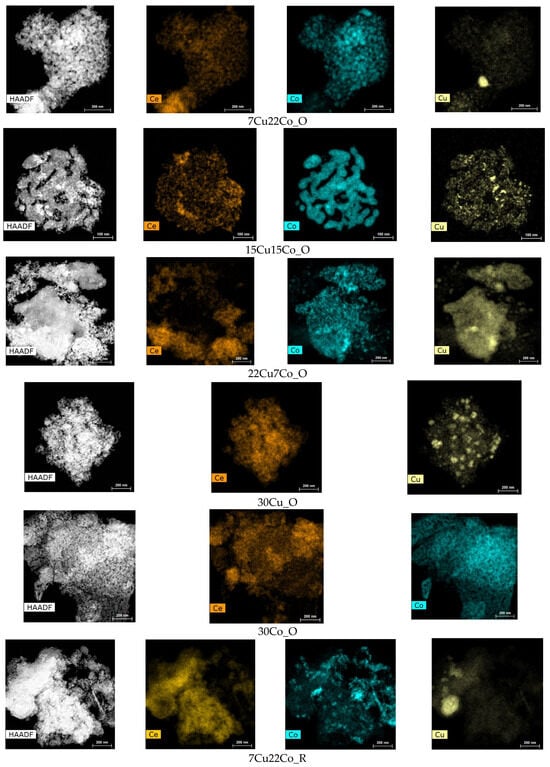The morphology and dispersion of Ce, Cu, and Co were examined by transmission electron microscopy (TEM) combined with energy-dispersive X-ray spectroscopy (EDS), using a FEI Talos F200X microscope (Thermo Fisher Scientific, Waltham, MA, USA). This instrument integrates high-resolution STEM and conventional TEM imaging modes with EDS-based elemental mapping, enabling spatially resolved 3D chemical characterization. Prior to analysis, samples were ultrasonically dispersed in ethanol, and a drop of the suspension was deposited on a carbon-coated copper grid (300 mesh).