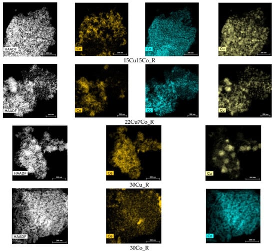 The morphology of the particles (Figure S6) was analysed using transmission electron microscopy (TEM), and the distribution of the elements within the particles was analysed using energy-dispersive spectroscopy (EDS) mapping (see Figure 2). Firstly, the images (Figure S6) provide confirmation of the XRD analysis in the sense that the particle size was reduced when the oxides were reduced, and therefore, these solids showed lower crystallinity. Conversely, the presence of particles exhibiting both large polyhedral shapes and smaller, more rounded shapes can be observed irrespective of whether the oxides or reduced solids are analysed. It was not feasible to measure the spacing between the different crystallographic planes due to the scale of the images. This precludes the determination of the crystalline phase to which each particle belongs; however, based on the XRD analyses, it can be hypothesised that the observed polyhedral particles are likely CeO2 since the most intense diffraction peaks correspond to the fluorite phase of CeO2. In contrast, the smaller, rounder particles are likely to be copper or cobalt oxides. Upon reduction, these particles would become metallic Cu or Co particles.