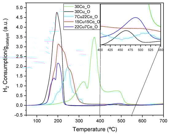 The curves of the monometallic catalysts show a band with a maximum at a temperature of 115 °C for the 30Cu_R catalyst and at 174 °C for the 30Co_R catalyst, while 30Cu_R shows an intense and broad band extending from 180 to 480 °C and a less intense band at higher temperatures. The 30Co_R catalyst shows a more complex profile with different peaks (246, 331, 440, and 559 °C). Considering the aforementioned points, we can tentatively associate the bands at 115 and 174 °C with the dissociation of H2 on Cu and Co metal centres []. The band appearing between 180 and 480 °C is for 30Cu_R, and the bands between 200 and 490 °C, in the case of 30Co_R, are for the interaction of H2 with the M-MOx and/or Mδ+-CeO2 interfaces [,,], and the bands above 500 °C correspond to spillover processes [,].