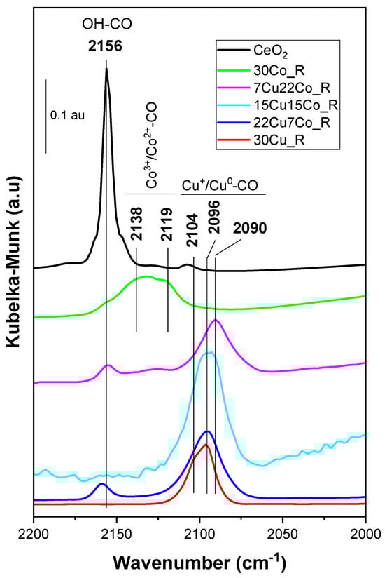 The adsorption of CO has also been studied by DRIFT spectroscopy to obtain information about the oxidation state of metals. The process of adsorption was conducted at a low temperature of −150 °C to prevent a reaction between the CO and the catalyst surface, which could cause an electronic effect on the cationic centres. This temperature allows the weak CO adsorption on metal cations to be more clearly observable. Ceria exhibits an intense band (Figure 4) at 2156 cm−1 with two shoulders: one at a higher wave number (2163 cm−1) and one at a lower wave number (2146 cm−1). The other catalysts show this band but with significantly reduced intensity, except for catalyst 30Cu_R. The band at 2156 cm−1 was associated with the interaction of CO with weak surface OH acid centres, and the band at 2163 cm−1 was associated with the adsorption of CO on Ce4+ []. The bands at 2127 cm−1 (very weak) and 2107 cm−1 have been described as the interaction of CO with Ce3+ [,]. Therefore, given their absence, it can be concluded that their presence on the exposed surface is negligible.