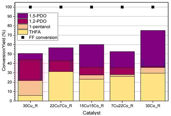 The literature has already shown that copper-based catalysts are more selective in opening the ring between C5 and O6 [,,,], while Co catalysts are more selective at 1.5-PDO by opening the ring between C2 and O6 [,,] (Figure 7). Under the reaction conditions tested, these catalysts have not shown activity in opening the furan ring once THFA has been formed, as has been shown by other authors [,,,,]. On the other hand, the formation of 1-pentanol is the product of the hydrogenolysis reaction of 1,5-PDO, while 2-MF is formed from the breaking of the C1-O1 bond of the alcohol group of FFA (Figure 7). The formation of FFA was not observed, which is the intermediate product of the reaction from which pentanediols can be formed by ring opening and subsequent hydrogenation of the diene formed [,], 2-MF by hydrogenolysis of the C1-O1 bond, or THFA by hydrogenation of the furan ring. This finding suggests that the formation of FFA must be very rapid and that its conversion to other products must also be greatly favoured by these catalysts. As is shown later, the possibilities for producing different compounds depend largely on the catalyst used as well as on the reaction conditions. The formation of THFA over Co-based catalysts was also associated with the Co particle sizes since bigger particles were prone to adsorb the furan ring by a flat adsorption configuration, giving rise the formation of THFA [].