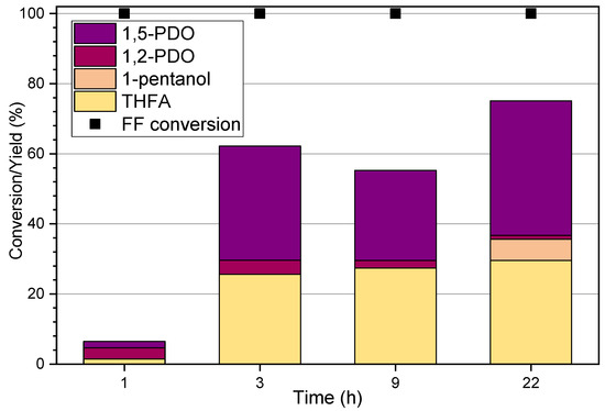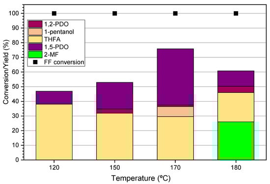 Continuing with the study of how reaction conditions affect the outcome, the effect of temperature was studied (Figure 9), keeping the rest of the parameters constant. The yield at 1.5-PDO follows a volcano-like trend, reaching its maximum at 170 °C, at the expense of THFA [,]. If the reaction temperature is increased to 180 °C, then the hydrogenolysis of FFA to 2-MF is favoured over the opening or hydrogenation of the furan ring []. At lower reaction temperatures, THFA is the major reaction product, as shown by other authors [,,], because lower temperatures favoured a parallel orientation of the furan ring in relation to the metal surface, facilitating the hydrogenation of the furan ring [].