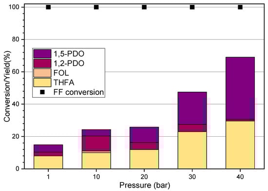 Another parameter that has a significant impact on this reaction is the initial H2 pressure. To this end, the evolution of the reaction products was studied from 1 bar of H2 to 40 bar, while all other parameters were kept constant (Figure 10). Increasing the pressure has been shown to improve product yield by reducing the amount of other unquantifiable products. Furthermore, it was observed that a minimum of 30 bar of H2 is required to achieve yields of 1.5-PDO exceeding 20%. In contrast, the 30Co_R catalyst was shown to reduce FF to THFA at a pressure of 1 bar, indicating its capacity to activate sufficient H2 to hydrogenate the furan ring. However, higher pressures are required to open this ring, as demonstrated by Wang et al. [] with CuCe-based catalysts. It is only at a pressure of 10 bar that a residual presence of FFA (approximately 1%) is observed.