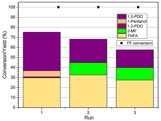 Finally, the recyclability of the 30Co_R catalyst was evaluated after five reaction cycles (Figure 11). After each cycle, the dissolution was removed, and a new fresh solution was poured into the reactor without reactivating the catalyst. FF conversion was complete in all cycles, although, as demonstrated in Figure 11, the carbon balance declined from the first cycle onwards. The yield at 1.5-PDO exhibits a decline from one cycle to the next, reaching 10% after the fifth cycle, whereas THFA remains stable during the first three cycles and then also declines in the fourth and fifth cycles. It was observed that, while 2-MF was a minor compound in the initial cycle (<1%), its production increased from the second cycle onwards, remaining stable from cycles 2 to 5.