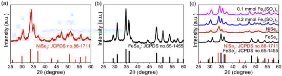 XRD patterns of samples prepared with different solutes: (a) Ni(acac)2 and selenium powder, (b) Fe2(SO4)3 and selenium powder, (c) Ni(acac)2, selenium powder, and Fe2(SO4)3.
