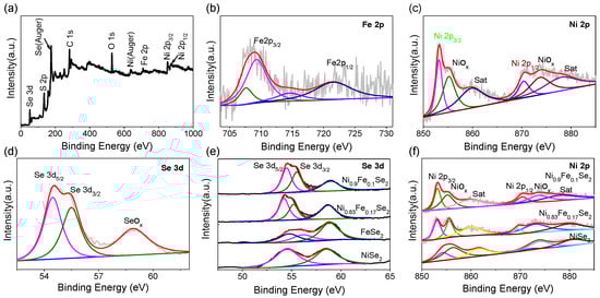 To further investigate the effects of different Fe2(SO4)3 doping amounts on the products, we performed XPS characterization on the products, with the results shown in Figure 3. Figure 3a displays the XPS survey spectrum of the Ni0.9Fe0.1Se2 sample obtained by doping with Fe2(SO4)3. Figure 3b–d present the corresponding high-resolution spectra of Fe2p, Ni2p, and Se3d for this sample, respectively. Figure 3e,f show the comparative spectra of Se3d and Ni2p for the four samples: Ni0.9Fe0.1Se2, Ni0.83Fe0.17Se2, FeSe2, and NiSe2. All spectra were calibrated using the C1s peak at the binding energy of .