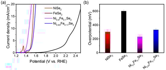 Among these 3d transition metal catalysts, transition metal compounds (e.g., oxides [13,14,15], phosphides [7,16], selenides [17,18]) are regarded as promising alternatives to precious metal OER catalysts, owing to their high catalytic activity, excellent stability, unique redox characteristics, and low cost [19,20,21]. In particular, metal selenides have garnered considerable interest in the OER field due to their tunable electronic structure, corrosion resistance, and favorable intrinsic activity [22,23]. For instance, Nath’s group reported Ni3Se2 synthesized via electrodeposition, requiring only overpotential to achieve in KOH [23]. Cai et al. demonstrated high stability for dendrite-like nanostructured NiSe2 synthesized via a co-reduction method, showing an overpotential decay of only after cycles [24]. Chen et al. grew NiSe2 on nickel foam in a tube furnace at and used it as a highly efficient HER catalyst [25]. Furthermore, studies indicate that incorporating a third element or other external functional materials into binary alloy catalysts often significantly enhances their electrocatalytic performance. For example, research has found that even trace amounts of iron () doping can dramatically boost the OER activity of and based catalysts [26,27]. Boettcher and colleagues, while investigating the electrocatalytic water oxidation performance of solution-cast metal oxide films in alkaline medium, affirmed the enhancement effect of iron [28]. Subsequently, the same research group reported the effects of iron—either accidentally or intentionally incorporated into Ni(OH)2/NiOOH electrodes—during the OER in KOH. They also observed that the OER activity of Ni(OH)2 peaked when the iron content reached an atomic percentage between and [29,30]. As for iron doping in nickel selenides, it was first reported by Du et al., who synthesized dendritic nanostructured Ni0.5Fe0.5Se2 and urchin-like Ni1.12Fe0.45Se2 catalysts, both exhibiting outstanding OER activity and durability in alkaline media [31,32]. Later, Chang et al. synthesized Fe-doped nickel selenide on carbon nanotubes, which significantly enhanced their electrocatalytic oxygen evolution activity, requiring only an overpotential of to achieve a current density of [33]. Deng et al. fabricated an iron-doped nickel selenide (NF/NiSe/Ni3Se2-Fe) catalyst on nickel foam via electrodeposition. This catalyst exhibited overpotentials of for OER at a current density of [18].