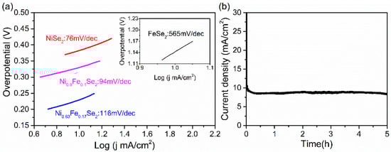 (a) Tafel plots of NiSe2, FeSe2, Ni0.9Fe0.1Se2, and Ni0.83Fe0.17Se2. (b) Variation in current density with time for the Ni0.9Fe0.1Se2 under constant potential.
