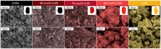 The microstructures of the synthesized cadmium-based pigments were examined using scanning electron microscopy (SEM), as shown in Figure 1. All samples were prepared via a two-step synthesis process—the initial dissolution of precursors at moderate temperature (60 °C), followed by hydrothermal treatment in a Teflon-lined autoclave at 160 °C for 24 h. The resulting powders were labeled according to their estimated chemical composition, defined by the molar percentage of CdS. Grain size distributions were determined using ImageJ v1.54p software based on SEM image analysis. The as-synthesized materials exhibited a range of colors, bright yellow for pure CdS, transitioning through orange-red and brown to nearly black for CdSe, corresponding to their compositional variation and related band gap shifts. Pure CdS displayed aggregated and irregularly shaped grains with particle sizes ranging from approximately 80 to 235 nm, characteristic of polycrystalline sulfide systems. In contrast, CdSe powders exhibited a more uniform and refined grain morphology, consisting of faceted particles with sizes ranging from 35 to 45 nm. The CdS1−xSex composites revealed heterogeneous microstructures, with visible changes in particle morphology as a function of selenium content. Notably, increasing Se substitution resulted in smoother surface textures and a progressive reduction in particle size. For example, in the 90 mol% CdS composite, particles ranged from 80 to 250 nm, whereas in the 50 mol% CdS sample, finer grains with dimensions between 25 and 40 nm were observed.