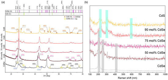 (a) XRD pattern and (b) Raman spectra of the obtained cadmium pigments of CdS, CdSe, and CdS1−xS powders. The green symbols correspond to the selenium diffraction patterns.