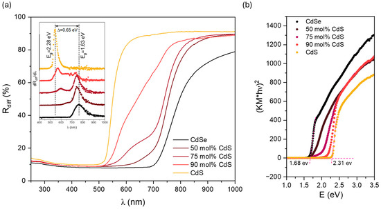 As expected, the fundamental absorption edge systematically shifts with composition. The band gap energy (Eg) was estimated from the first derivative of the reflectance spectra (dRdiff/dλ), by identifying the maximum slope corresponding to the absorption onset. For pure CdSe, the estimated Eg is approximately 1.63 eV, while for CdS, it increases to 2.28 eV, consistent with values in the literature and the known compositional dependence of the band gap. In the case of CdS1−xSex solid solutions, two distinct optical transitions are observed, indicating the presence of compositional or structural heterogeneity. Specifically, the extracted optical transition corresponds to 1.66 and 1.90 eV for 50 mol% CdS, 1.67 and 2.09 eV for 75 mol% CdS, and 1.71 and 2.20 eV for 90 mol% CdS. These dual features suggest the coexistence of regions with different local compositions or degrees of crystallinity within the same material. To confirm the above results, the spectra were also analyzed by plotting the absorption coefficient versus phonon energy using Tauc plot. In the Tauc relation [54],