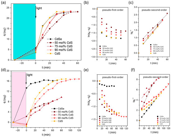 All tested photocatalysts exhibit measurable dye degradation, although the effectiveness is strongly dependent on both the chemical composition of the pigment and the nature of the dye. For indigo carmine, the cadmium-based materials exhibit a notable adsorption capacity in the dark, with dye uptake ranging from 3.66 to 5.80 µg, indicating favorable electrostatic and surface interactions with the anionic dye. This pre-adsorption step likely facilitates subsequent photocatalytic degradation. Among the tested samples, the highest photodegradation efficiency is observed for the pure CdSe and CdS powders. In contrast, the lowest photocatalytic activity is exhibited by the 50 mol% CdS sample. According to XRD data, this particular composition is biphasic, containing both CdSe and a mixed CdSSe phase (21.3%), which indicates the incomplete incorporation of sulfur and selenium into a uniform solid solution. Interestingly, despite the shift in diffraction peaks toward higher 2θ angles, which is commonly interpreted as indicative of solid solution formation, this structural adjustment does not translate into enhanced photoactivity. This unexpected behavior suggests that structural disorder or inefficient charge separation at the interface of multiple phases may hinder photocatalytic performance in the 50 mol% CdS sample. To better elucidate the underlying degradation mechanisms and differentiate between surface adsorption and actual photocatalytic activity, kinetic modeling was performed using the Lagergren kinetics model [67,68,69].