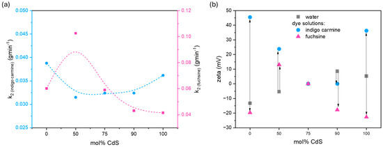 In the case of the 50 mol% and 90 mol% CdS samples, a pronounced shift in zeta potential is observed in both dye environments, towards more positive values in the anionic dye and more negative values in the cationic one. This behavior implies non-selective adsorption mechanisms or the dominance of factors beyond simple electrostatic interactions. Possible explanations include the presence of surface functional groups with variable charge states, the formation of a compact dye layer that screens the inherent charge of the powder, or specific molecular interactions involving dipole moments or hydrogen bonding within the electrical double layer. In contrast, the zeta potential of the 75 mol% CdS sample remains nearly unchanged regardless of the dye present. This indicates an electrically neutral surface under the experimental conditions, suggesting the minimal or weak adsorption of dye molecules. The lack of surface charge alteration aligns well with the low photocatalytic activity and the reduced k2 rate constants observed for this composition. Such behavior may arise from the limited availability of active sites or steric hindrance that prevents effective dye–surface interaction, further underscoring the role of surface properties in modulating photocatalytic performance.