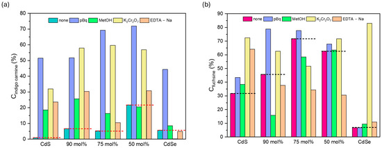 Regardless of the dye type, the highest photocatalytic activity was exhibited by CdS and CdSe powders. However, in the case of indigo carmine, the key role in the photodegradation mechanism is attributed to superoxide radicals (O2•−), whereas for fuchsine, the dominant contribution comes from photogenerated electrons (e’). Notably, for CdS, each scavenger test resulted in a noticeable suppression of the reaction rate, indicating that the presence of all reactive species, like O2•−, •OH/SO4•−, e−, and h+, is crucial for efficient degradation. A similar pattern is observed for fuchsine, underscoring the importance of a synergistic interaction between charge carriers and ROS. Interestingly, for CdSe in the presence of indigo carmine, the addition of charge carrier scavengers accelerates the dye decomposition process. On the one hand, this suggests that trapping excess charge carriers reduces electron–hole recombination, thereby enhancing the availability of e’ or h⁺ for redox reactions. This behavior implies that, before scavenger addition, these carriers may have participated in competing side reactions or recombined prematurely, limiting overall efficiency. In contrast, the lack of change in fuchsine concentration upon the addition of p-benzoquinone indicates that superoxide radicals are not significantly involved in its degradation mechanism.