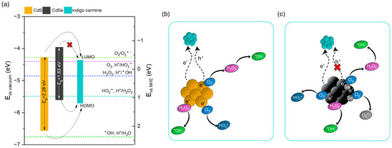 To better understand the role of particular ROS in the photocatalytic degradation of dyes, the energy levels of the valence (EVB) and conduction (ECB) band edges for CdS and CdSe were calculated, and the HOMO and LUMO levels of indigo carmine were experimentally determined. The obtained schematic energy diagram for IC and photocatalysts is presented in Figure 7a.