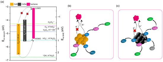 A similar trend in pH variation was observed for the semiconductor–fuchsine system. The initial pH of the FC dye solution was determined as 6.74. Upon the addition of CdS, the pH shifted towards acidic values (4.53), whereas in the presence of CdSe it increased towards alkaline conditions (9.15). These results suggest that the predominant reactive oxygen species are HO2• in the CdS system and O2•− in the CdSe system, respectively. Although in both cases the direct degradation of the dye by photogenerated electrons is not feasible, the electrons play a crucial role in the generation of specific ROS, thereby accelerating the degradation pathways (Figure 8b,c). By correlating the constructed energy diagram with the scavenger test, the central role of electrons in the photocatalytic mechanism is confirmed. Moreover, as demonstrated in the case of solid solutions (Figure 6b), the effective exclusion of photogenerated holes reduces the probability of recombination processes. It enhances the fraction of electron-driven reactions, further promoting the efficiency of the photocatalytic degradation.