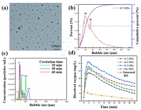 (a) Bubble distribution from the 3D microscopy, (b) size distribution of microbubbles, (c) size distribution and concentration of nano bubbles at different MNB generator cycle times, and (d) DO at different outlet pressures, the orange line was the saturated DO as a comparison.