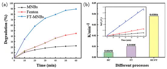 (a) The removal efficiency of indole with time, and (b) the reaction rate constant of the conventional Fenton, MNBs, and the FT-MNB systems.