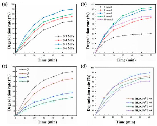 The influences of inlet pressure on degradation are shown in Figure 3a. The removal efficiency increased with the inlet pressure (in the range of 0.3–0.5 MPa), and the removal efficiency was up to 89.35% at 60 min under the inlet pressure of 0.5 MPa, and the removal efficiency decreased if the inlet pressure increased to 0.6 MPa. Therefore, the inlet pressure was set at 0.5 MPa in the following experiments. The influences of dosage of H2O2 on degradation are shown in Figure 3b, as the H2O2 dosage increased from 2 to 8 mmol/L, the removal efficiency increased from 39.98% to 93.26%. When the H2O2 dosage increased to 10 mmol/L, the removal efficiency decreased to 75.86%, which might have been due to excess H2O2 quenching the hydroxyl radicals as in Equations (4) and (5), which might have led to an ineffective reaction of the free radicals. When the dosage of H2O2 was 6 and 8 mmol/L, the removal efficiency of indole only increased by 3.91%. From an economical point of view, the dosage of H2O2 in the following study was set at 6 mmol/L.