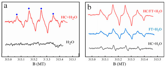 ESR spectra in (a) pure water and the HC system, and (b) HC, conventional Fenton, and FT-MNBs.