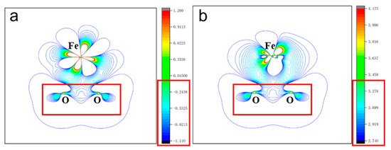 In a traditional Fenton reaction, the O-O bond in H2O2 breaks by acquiring electrons from Fe2+ to generate •OH and OH−. Differential charge density maps reveal that during the reaction between Fe atoms and H2O2 under conventional conditions (Figure 7a), the electron-acquiring capacity of the O-O bond in H2O2 is relatively weak, even exhibiting an electron loss state (approximately 0–1.11 e), which is not conducive to bond breaking. While at the MNB interface (Figure 7b), the electron-acquiring capacity of the O-O bond is significantly enhanced to an electron-rich state (approximately 2.74–3.28 e), facilitating electron-mediated bond breaking. From an electronic orbital perspective, the electronic effect of the MNB surface induces two critical modifications: First, they alter the 3d orbital configuration of Fe, transforming its isolated petal-shaped structure into an overlapping state with the 2p bonding orbitals of O-O, and thereby enhancing electron mediation between Fe and O. Second, the interactions among bubbles, Fe2+ and H2O2, increase the electron density of the Fe and O-O system, substantially strengthening the electron-acquiring capability of the O-O bond and effectively facilitating its breaking to generate free radicals.