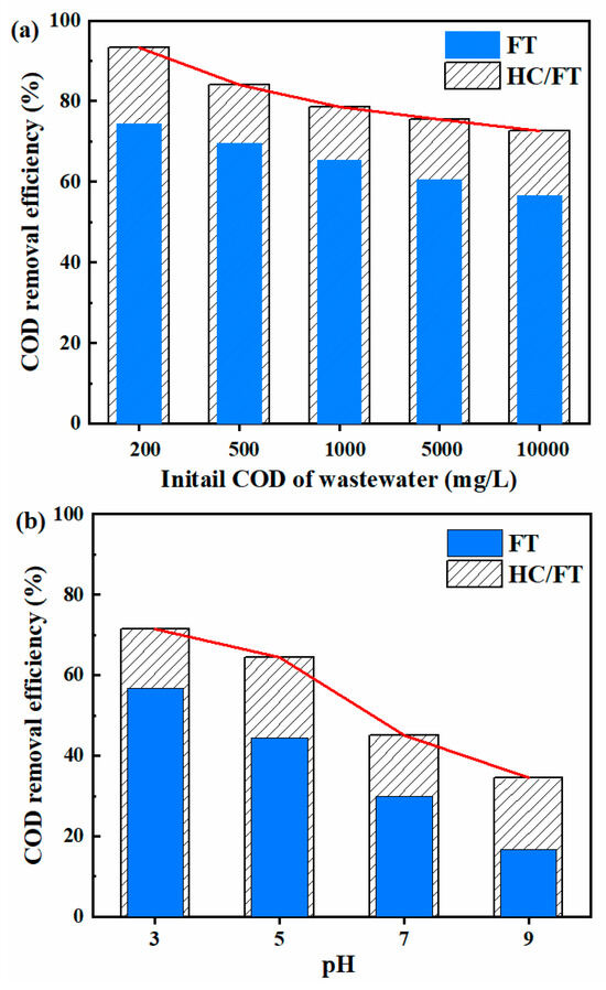 Effect of (a) the initial COD of the industrial coking wastewater and (b) pH on COD removal efficiency.