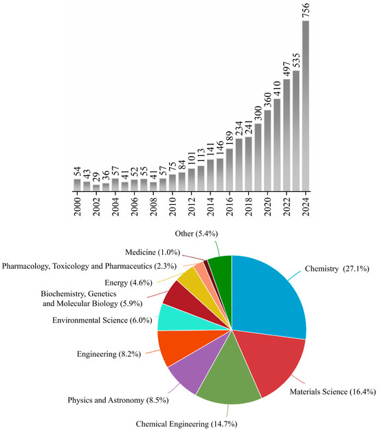 The graphs show the evolution of research and thematic areas in mechanochemistry: the first presents the number of articles published annually on mechanochemistry, while the second is divided by thematic area of study on mechanochemistry by thematic area, in the period from 2000 to 2025 [16].