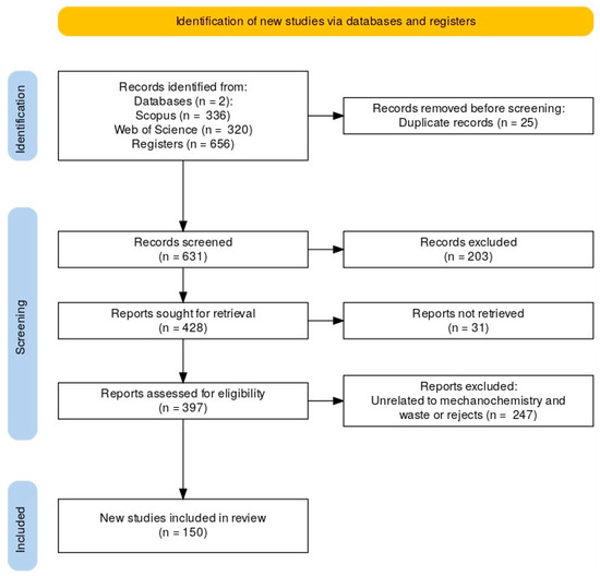 Initially, searching with keywords identified 656 potential articles: 336 from the Scopus database and 320 from the Web of Science database (Figure 3). Of the initial 656 articles, 25 were excluded for being duplicates files. The remaining 631 files were evaluated by title, abstract, and keywords, with 203 articles excluded for not being suitable for the scope of the study. There remaining 428 articles were selected for full-text evaluation, 31 of which were not retrieved, 62 were excluded because they were not related to mechanochemistry, 82 articles were not related to mechanochemistry applied to waste or rejects, and another 103 were reviewed articles. Therefore, 150 articles were selected from the Scopus and Web of Science databases and included in the review.